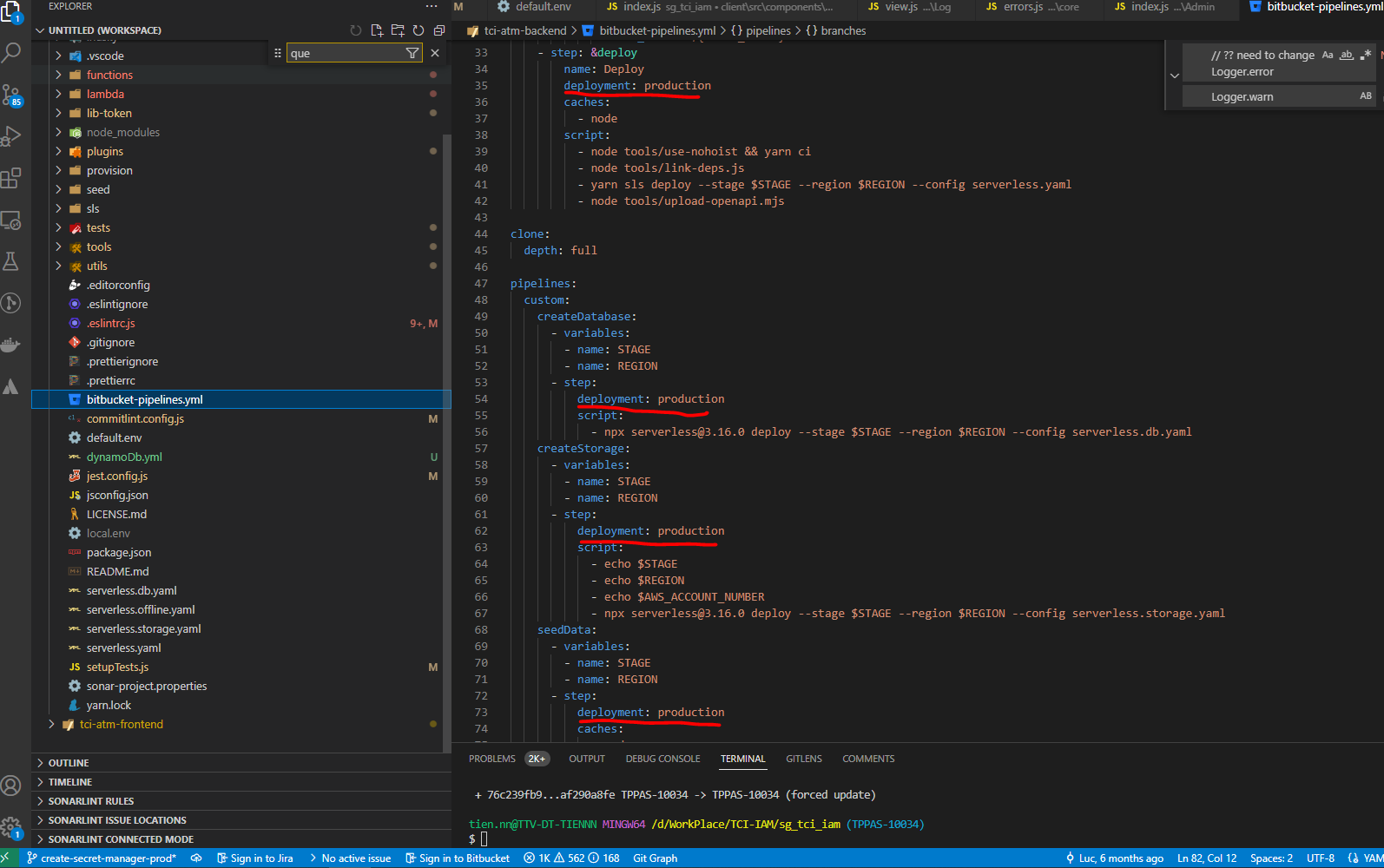 d. After writing the variable on Bitbucket, the User clones the Back End source code from Bitbucket and then adds it to a new environment in the Bitbucket-pipelines file by configuration to development: production. Please refer the highlighted points below