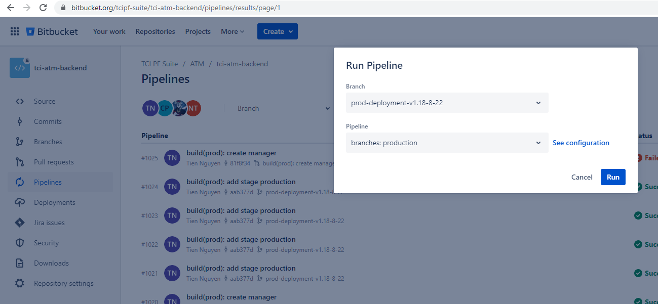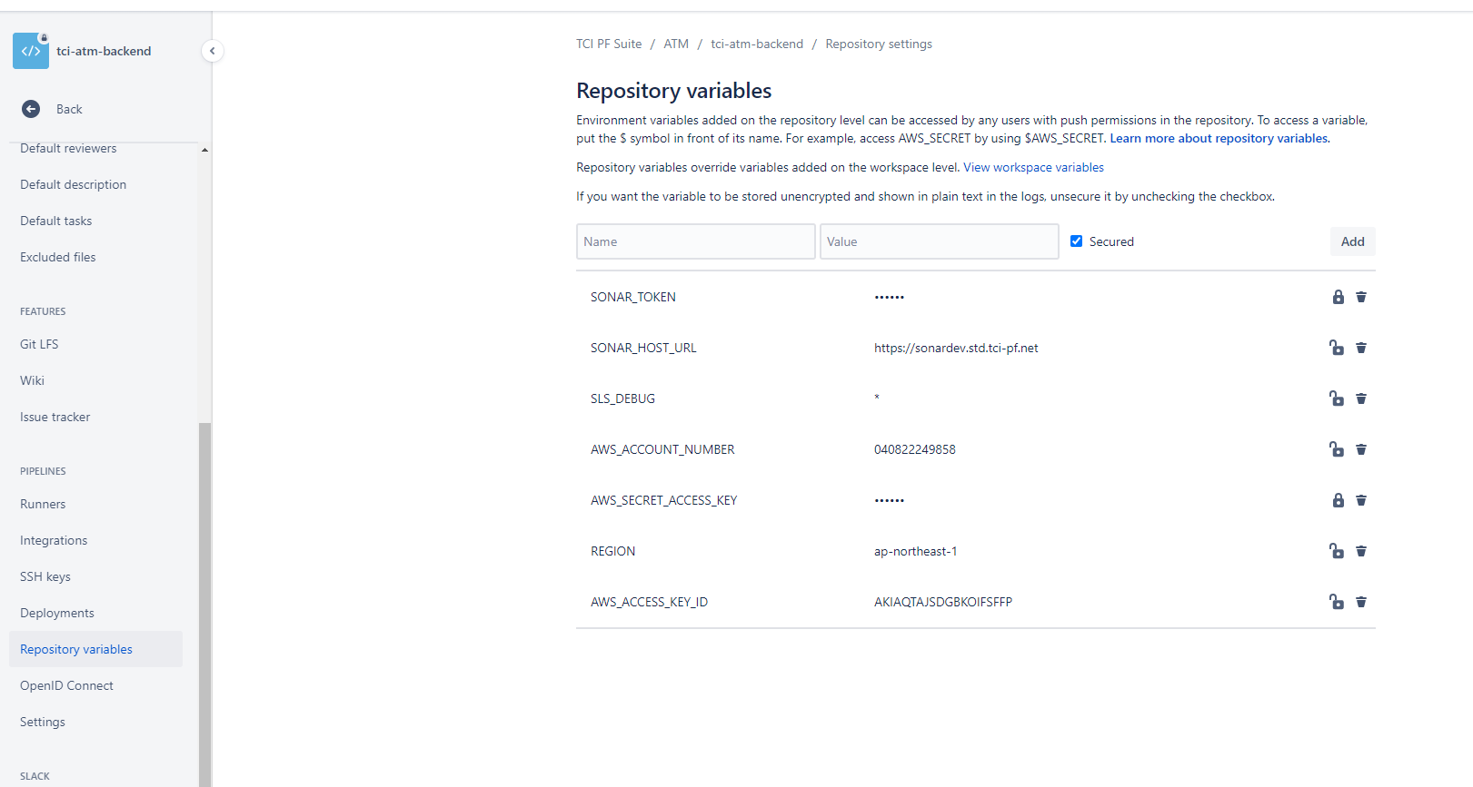 Access the link https://bitbucket.org/tcipf-suite/tci-atm-backend/src/main/ Click on The Repository Settings then select Repository variables