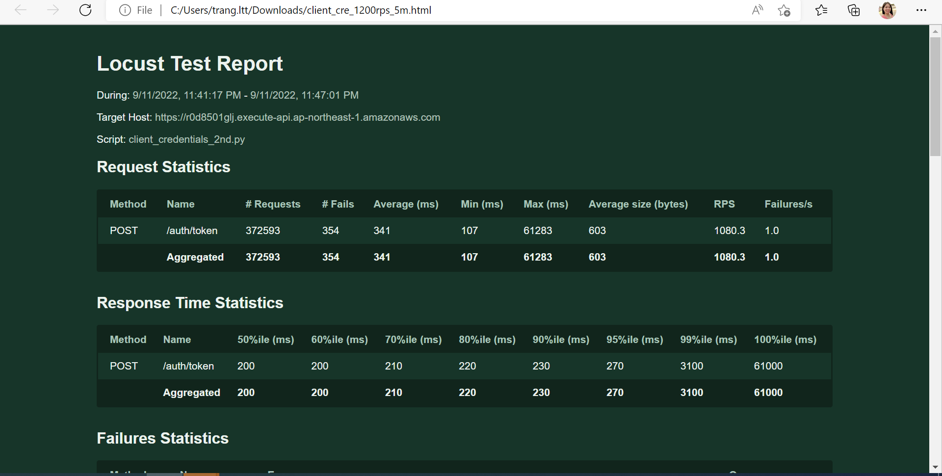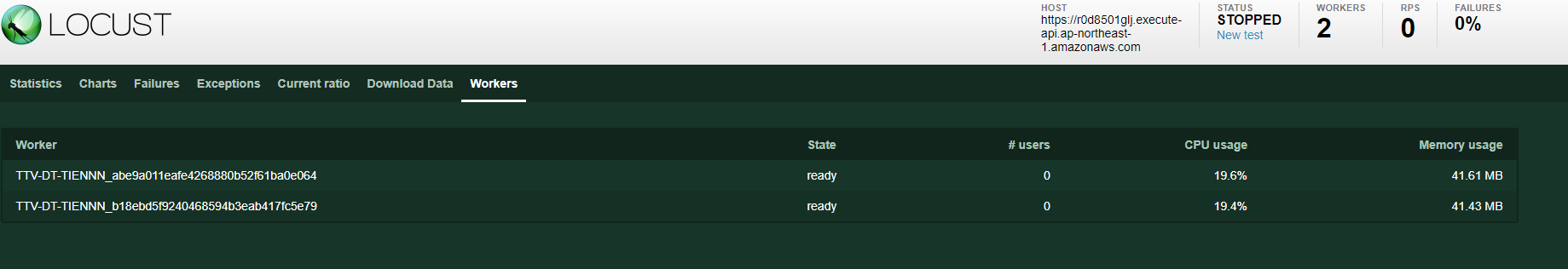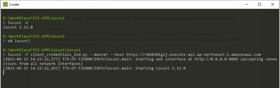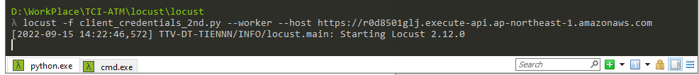 Step 2: After created the file above, we start Locust (Distributed load generation) to run stress test.