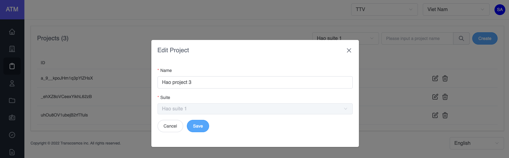 - The Edit Project popup will be displayed, you can update the project's name